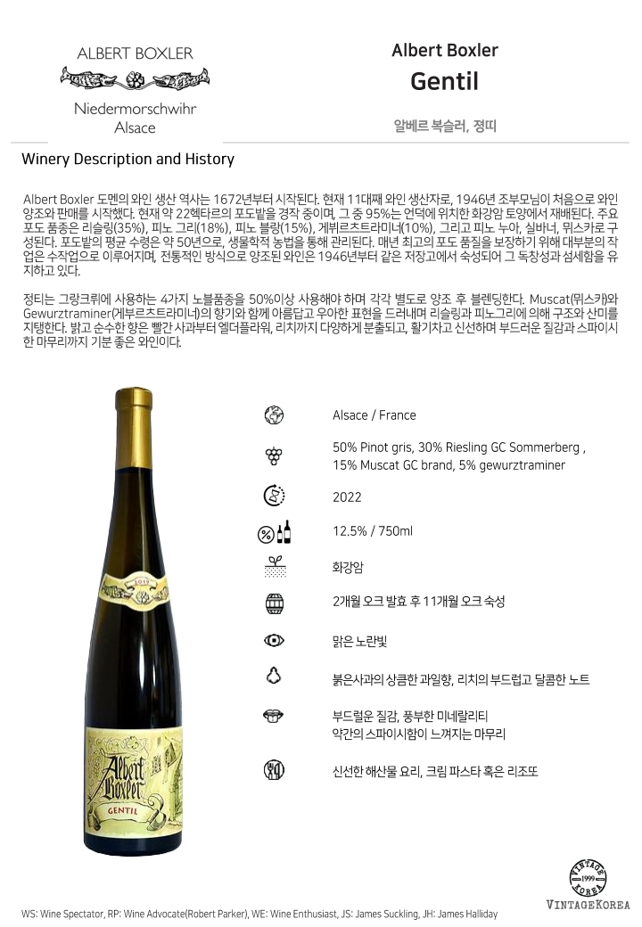 정티는 그랑크뤼에 사용하는 4가지 노블품종을 50%이상 사용해야 하며 각각 별도로 양조 후 블렌딩한다. Muscat(뮈스카)와 Gewurztraminer(게부르츠트라미너)의 향기와 함께 아름답고 우아한 표현을 드러내며 리슬링과 피노그리에 의해 구조와 산미를 지탱한다. 밝고 순수한 향은 빨간 사과부터 엘더플라워, 리치까지 다양하게 분출되고, 활기차고 신선하며 부드러운 질감과 스파이시한 마무리까지 기분 좋은 와인이다.