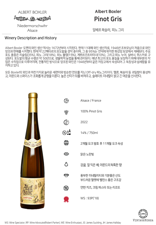 모든 Boxler의 와인과 마찬가지로 놀라운 세련미와 방순한 면모를 지닌 Off-dry 피노그리이다. 멜론, 복숭아 등 과일향이 풍성하고, 아몬드와 스파이스가 조화롭게 균형을 이룬다. 높은 산미가 뒤를 바쳐주고, 슬레이트 미네랄이 밝고 긴 여운을 선사한다.