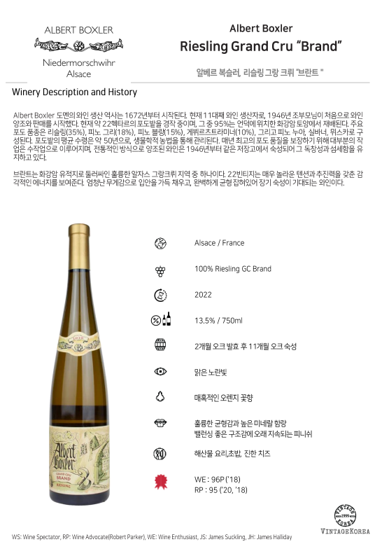 브란트는 화강암 유적지로 둘러싸인 훌륭한 알자스 그랑크뤼 지역 중 하나이다. 22빈티지는 매우 놀라운 텐션과 추진력을 갖춘 감각적인 에너지를 보여준다. 엄청난 무게감으로 입안을 가득 채우고, 완벽하게 균형 잡혀있어 장기 숙성이 기대되는 와인이다.