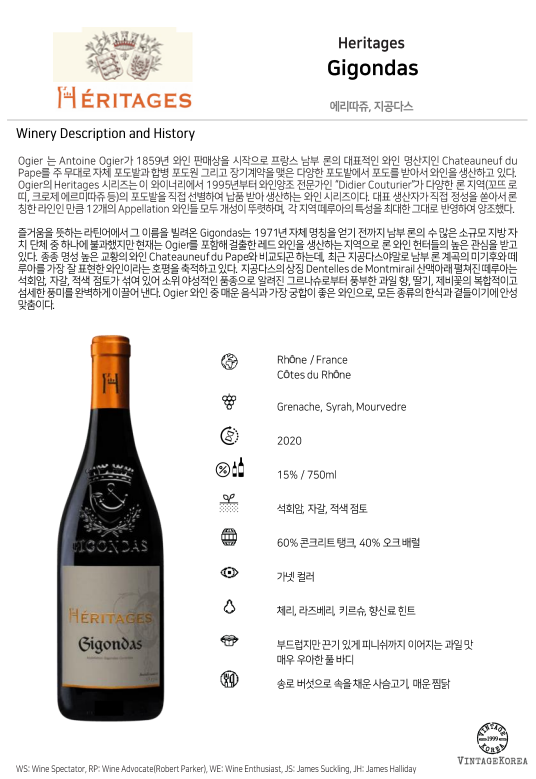 즐거움을 뜻하는 라틴어에서 그 이름을 빌려온 Gigondas는 1971년 자체 명칭을 얻기 전까지 남부 론의 수 많은 소규모 지방 자치 단체 중 하나에 불과했지만 현재는 Ogier를 포함해 걸출한 레드 와인을 생산하는 지역으로 론 와인 헌터들의 높은 관심을 받고 있다. 종종 명성 높은 교황의 와인 Chateauneuf du Pape와 비교되곤 하는데, 최근 지공다스야말로 남부 론 계곡의 미기후와 떼루아를 가장 잘 표현한 와인이라는 호평을 축적하고 있다. 지공다스의 상징 Dentelles de Montmirail 산맥아래 펼쳐진 떼루아는 석회암, 자갈, 적색 점토가 섞여 있어 소위 야성적인 품종으로 알려진 그르나슈로부터 풍부한 과일 향, 딸기, 제비꽃의 복합적이고 섬세한 풍미를 완벽하게 이끌어 낸다. Ogier 와인 중 매운 음식과 가장 궁합이 좋은 와인으로, 모든 종류의 한식과 곁들이기에 안성맞춤이다.