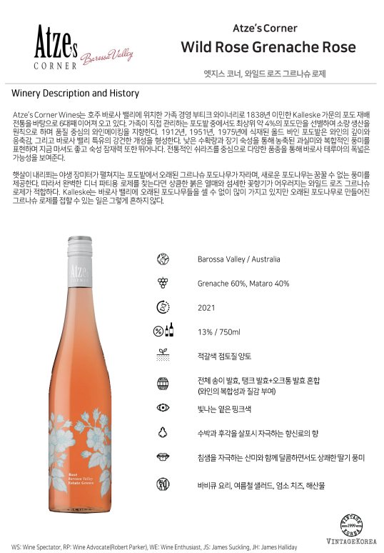 햇살이 내리쬐는 야생 장미터가 펼쳐지는 포도밭에서 오래된 그르나슈 포도나무가 자라며, 새로운 포도나무는 꿈꿀 수 없는 풍미를 제공한다. 따라서 완벽한 디너 파티용 로제를 찾는다면 상큼한 붉은 열매와 섬세한 꽃향기가 어우러지는 와일드 로즈 그르나슈 로제가 적합하다. Kalleske는 바로사 밸리에 오래된 포도나무들을 셀 수 없이 많이 가지고 있지만 오래된 포도나무로 만들어진 그르나슈 로제를 접할 수 있는 일은 그렇게 흔하지 않다.