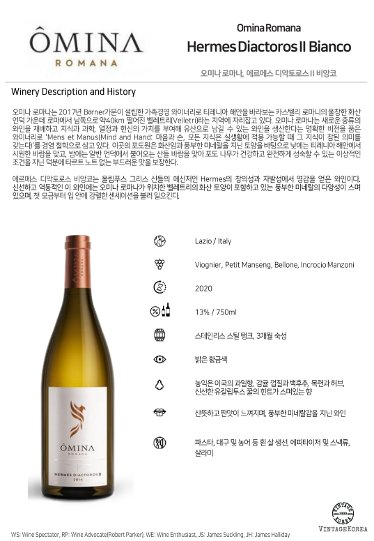 에르메스 디악토로스 비앙코는 올림푸스 그리스 신들의 메신저인 Hermes의 창의성과 자발성에서 영감을 얻은 와인이다. 신선하고 역동적인 이 와인에는 오미나 로마나가 위치한 벨레트리의 화산 토양이 포함하고 있는 풍부한 미네랄의 다양성이 스며 있으며, 첫 모금부터 입 안에 강렬한 센세이션을 불러 일으킨다.