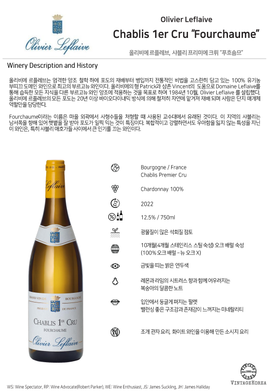 Fourchaume이라는 이름은 마을 외곽에서 사형수들을 처형할 때 사용된 교수대에서 유래된 것이다. 이 지역의 샤블리는 남서쪽을 향해 있어 햇볕을 잘 받아 포도가 일찍 익는 것이 특징이다. 복합적이고 강렬하면서도 우아함을 잃지 않는 특성을 지닌 이 와인은, 특히 샤블리 애호가들 사이에서 큰 인기를 끄는 와인이다.