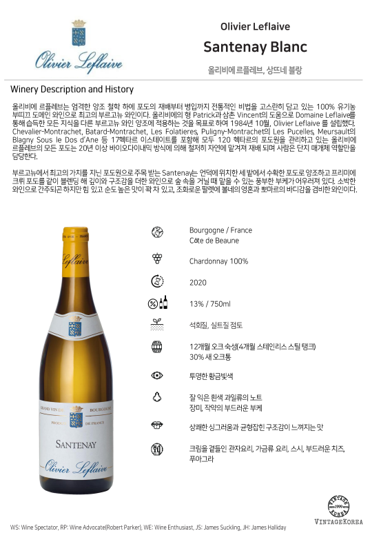 부르고뉴에서 최고의 가치를 지닌 포도원으로 주목 받는 Santenay는 언덕에 위치한 세 밭에서 수확한 포도로 양조하고 프리미에 크뤼 포도를 같이 블렌딩 해 깊이와 구조감을 더한 와인으로 숲 속을 거닐 때 맡을 수 있는 풍부한 부케가 어우러져 있다. 소박한 와인으로 간주되곤 하지만 힘 있고 순도 높은 맛이 꽉 차 있고, 조화로운 팔렛에 볼네의 영혼과 뽀마르의 바디감을 겸비한 와인이다.