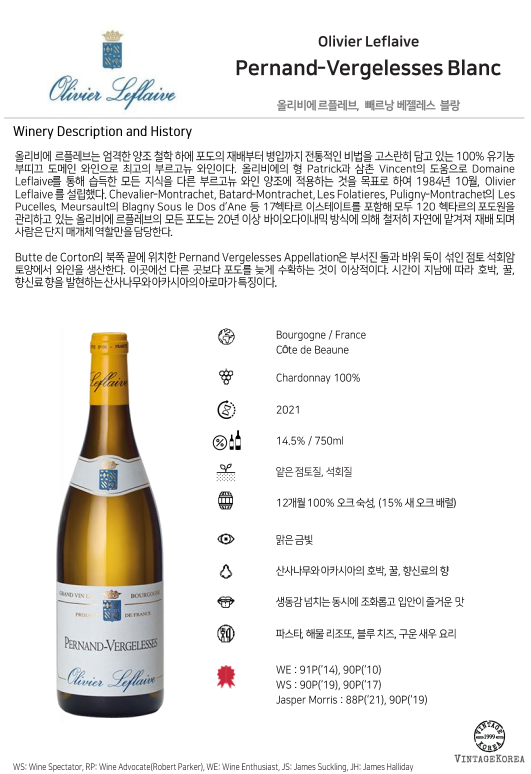 Butte de Corton의 북쪽 끝에 위치한 Pernand Vergelesses Appellation은 부서진 돌과 바위 둑이 섞인 점토 석회암 토양에서 와인을 생산한다. 이곳에선 다른 곳보다 포도를 늦게 수확하는 것이 이상적이다. 시간이 지남에 따라 호박, 꿀, 향신료 향을 발현하는 산사나무와 아카시아의 아로마가 특징이다.