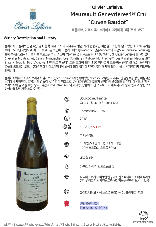 올리비에 르플레브, 호스피드 드 본 뫼르소 프리미에 크뤼 쥬느브리에르 뀌베 바도 (매그넘) 2018