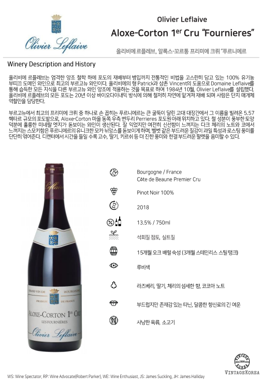 부르고뉴에서 최고의 프리미에 크뤼 중 하나로 손 꼽히는 푸르니에르는 큰 굴뚝이 달린 고대 대장간에서 그 이름을 빌려온 5.57 헥타르 규모의 포도밭으로, Aloxe-Corton 마을 동쪽 우측 변두리 Perrieres 포도원 아래 위치하고 있다. 철 성분이 풍부한 토양 덕분에 훌륭한 미네랄 엣지가 돋보이는 와인이 생산된다. 잘 익었지만 여전히 신선함이 느껴지는 다크 체리의 노트와 코에서 느껴지는 스모키함은 푸르니에르의 유니크한 모카 뉘앙스를 돋보이게 하며, 벨벳 같은 부드러운 질감이 과일 특성과 로스팅 풍미를 단단히 엮어준다. 디캔터에서 시간을 들일 수록 고수, 딸기, 키르쉬 등 더 진한 풍미와 한결 부드러운 팔렛을 음미할 수 있다.
