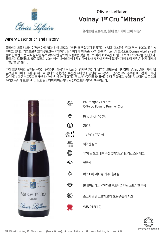 구어 프렌치어로 중간을 뜻하는 단어에서 파생된 Mitans은 경사면 가운데 위치한 포도원을 시사하며, Volnay에서 가장 덜 알려진 프리미에 크뤼 중 하나로 볼네의 전형적인 특징인 우아함에 단단한 구조감과 고급스럽고도 풍부한 바디감이 더해진 와인이다. 아주 부드럽고 미세한 타닌이 선사하는 매혹적인 텍스쳐가 구미를 확 끌어당긴다. 강렬하고 농축된 맛보다는 늘 균형과 우아한 풍미가 도드라지는 순도 높은 향미의 와인이다. 신선하고 드라이하게 마무리된다.