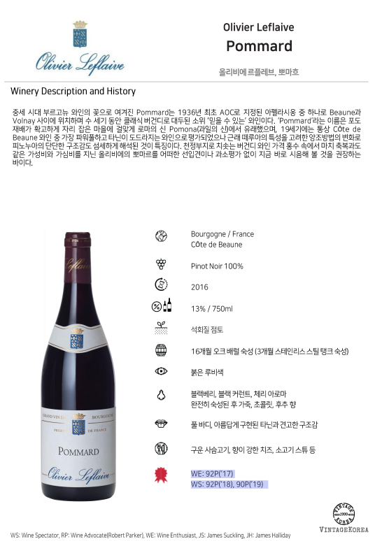 중세 시대 부르고뉴 와인의 꽃으로 여겨진 Pommard는 1936년 최초 AOC로 지정된 아펠라시옹 중 하나로 Beaune과 Volnay 사이에 위치하며 수 세기 동안 클래식 버건디로 대두된 소위 ‘믿을 수 있는’ 와인이다. ‘Pommard’라는 이름은 포도 재배가 확고하게 자리 잡은 마을에 걸맞게 로마의 신 Pomona(과일의 신)에서 유래했으며, 19세기에는 통상 CÔte de Beaune 와인 중 가장 파워풀하고 타닌이 도드라지는 와인으로 평가되었으나 근래 떼루아의 특성을 고려한 양조방법의 변화로 피노누아의 단단한 구조감도 섬세하게 해석된 것이 특징이다. 천정부지로 치솟는 버건디 와인 가격 홍수 속에서 마치 축복과도 같은 가성비와 가심비를 지닌 올리비에의 뽀마르를 어떠한 선입견이나 과소평가 없이 지금 바로 시음해 볼 것을 권장하는 바이다.