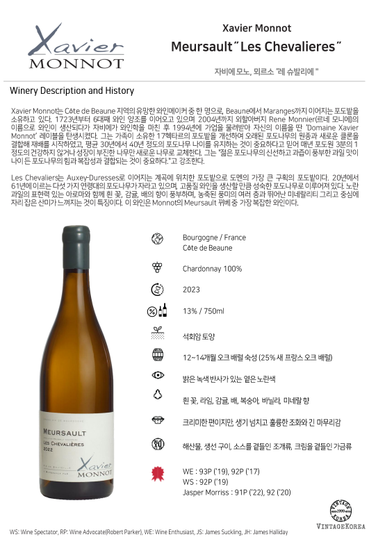 Les Chevaliers는 Auxey-Duresses로 이어지는 계곡에 위치한 포도밭으로 도멘의 가장 큰 구획의 포도밭이다. 20년에서 61년에 이르는 다섯 가지 연령대의 포도나무가 자라고 있으며, 고품질 와인을 생산할 만큼 성숙한 포도나무로 이루어져 있다. 노란 과일의 표현력 있는 아로마와 함께 흰 꽃, 감귤, 배의 향이 풍부하며, 농축된 풍미의 여러 층과 뛰어난 미네랄리티 그리고 중심에 자리 잡은 산미가 느껴지는 것이 특징이다. 이 와인은 Monnot의 Meursault 뀌베 중 가장 복잡한 와인이다.