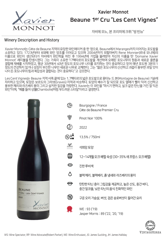 Les Cent Vignes는 Beaune 지역 서쪽 끝에 있는 1.7헥타르의 넓은 포도밭으로 몽타뉴 드 본(Montagne de Beaune) 기슭에 자리하고 있으며, 토양은 보르도의 그라브(Graves) 지역과 비슷하다. 토양의 배수가 잘 되므로 포도 열매가 빨리 익어 신선하고 풍부한 체리와 라즈베리 풍미 그리고 실키한 질감을 자랑한다. Xavier는 이 와인을 "마시기 편하고, 실크 같은 탄닌을 가진 잘 익은 와인"이며, "예를 들어 샹볼(Chambolle)처럼 부드러운 스타일"이라고 설명한다.