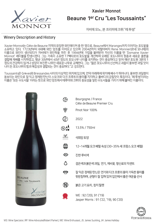 Toussaints은 Grèves와 Bressandes 사이의 이상적인 위치에 있으며, 언덕 아래쪽에 위치해 배수가 뛰어나다. 풍부한 과일향이 돋보이는 와인으로 잘 익고 정제된 탄닌이 스모크와 다크 프루트의 풍미를 지지하고 풀바디의 감칠맛이 특징이다. ‘레 투썽’이라는 이름은 ‘모든 수도사들’ 이라는 뜻으로 와인 양조에서 테루아와 크뤼의 중요성을 알린 수도사들을 기리기 위해 붙여진 이름이다.