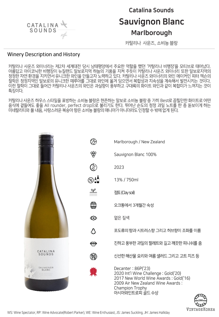 카탈리나 사운즈 하우스 스타일을 표방하는 소비뇽 블랑은 현존하는 말보로 소비뇽 블랑 중 가히 Best로 꼽힐만한 화이트로 어떤 음식에 곁들여도 좋을 All rounder, perfect drop으로 불리기도 한다. 뛰어난 순도의 청정 과일 노트를 한 층 돋보이게 하는 미네랄리티와 풀 내음, 사랑스러운 복숭아 향은 소비뇽 블랑의 매니아가 아니더라도 인정할 수 밖에 없게 된다.