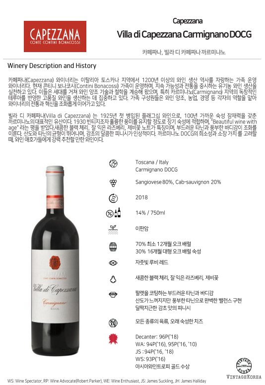 빌라 디 카페짜나(Villa di Capezzana) 는 1925년 첫 병입된 플래그십 와인으로, 100년 가까운 숙성 잠재력을 갖춘 까르미냐노의 대표적인 유산이다. 1930 빈티지조차 훌륭한 풍미를 유지할 정도로 장기 숙성에 적합하며, "Beautiful wine with age" 라는 평을 받았다.새콤한 블랙 체리, 잘 익은 라즈베리, 제비꽃 노트가 특징이며, 부드러운 타닌과 풍부한 바디감이 조화를 이룬다. 산도와 타닌의 균형이 뛰어나며, 감초의 달콤한 피니시가 인상적이다. 까르미냐노 DOCG의 희소성과 소장 가치 를 고려할 때, 와인 애호가들에게 강력 추천할 만한 와인이다.