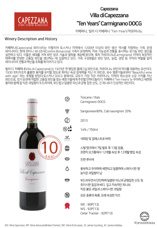 빌라 디 카페짜나(Villa di Capezzana) 는 1925년 첫 병입된 플래그십 와인으로, 까르미냐노 와인의 역사를 대표하는 유산이다. 1930 빈티지조차 훌륭한 풍미를 유지할 정도로 뛰어난 숙성 잠재력을 지닌 이 와인은, 유수 평론가들로부터 "Beautiful wine with age" 라는 호평을 받았다.토스카나 DOCG 중에서도 규모가 가장 작은 까르미냐노 지역의 희소성과 소장 가치를 지닌 와인으로, 장기 보관에 적합한 고품질 와인을 찾는 애호가들에게 추천할 만하다.빌라 디 카페짜나 ‘Ten Years’ 는 우아하고 세련된 풍미와 함께 잘 익은 과일향이 두드러지며, 부드럽고 달콤한 타닌과 균형 잡힌 산도, 긴 피니쉬가 인상적인 와인이다.