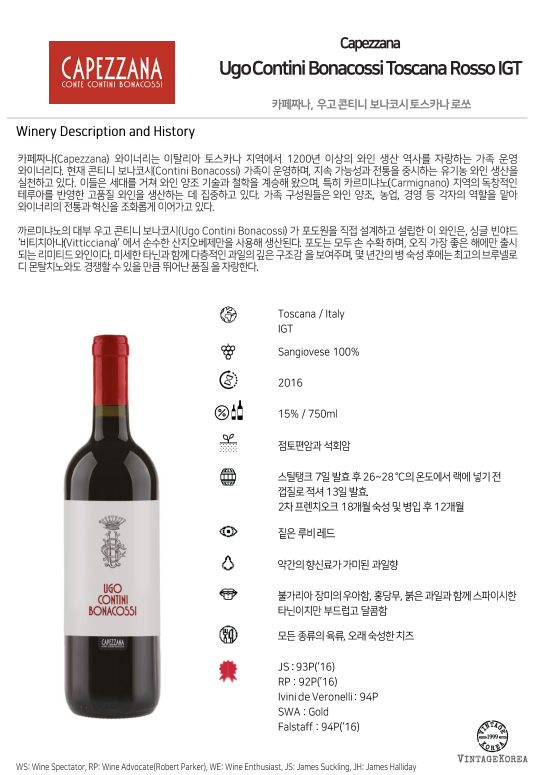 까르미냐노의 대부 우고 콘티니 보나코시(Ugo Contini Bonacossi) 가 포도원을 직접 설계하고 설립한 이 와인은, 싱글 빈야드 ‘비티치아나(Vitticciana)’ 에서 순수한 산지오베제만을 사용해 생산된다. 포도는 모두 손 수확 하며, 오직 가장 좋은 해에만 출시 되는 리미티드 와인이다. 미세한 타닌과 함께 다층적인 과일의 깊은 구조감 을 보여주며, 몇 년간의 병 숙성 후에는 최고의 브루넬로 디 몬탈치노와도 경쟁할 수 있을 만큼 뛰어난 품질 을 자랑한다.
