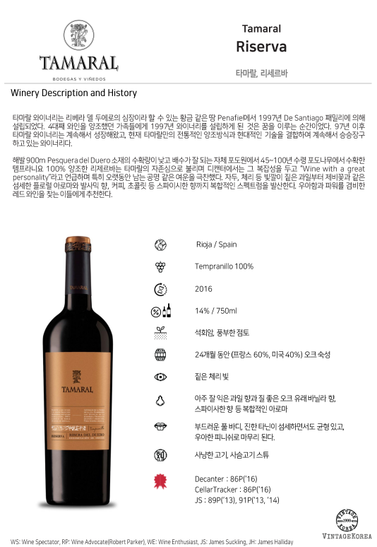 해발 900m Pesquera del Duero 소재의 수확량이 낮고 배수가 잘 되는 자체 포도원에서 45~100년 수령 포도나무에서 수확한 템프라니요 100% 양조한 리제르바는 타마랄의 자존심으로 불리며 디캔터에서는 그 복잡성을 두고 “Wine with a great personality”라고 언급하며 특히 오랫동안 남는 공명 같은 여운을 극찬했다. 자두, 체리 등 빛깔이 짙은 과일부터 제비꽃과 같은 섬세한 플로럴 아로마와 발사믹 향, 커피, 초콜릿 등 스파이시한 향까지 복합적인 스펙트럼을 발산한다. 우아함과 파워를 겸비한 레드 와인을 찾는 이들에게 추천한다.
