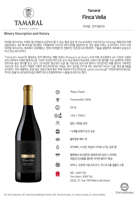 “Tamaral’s Jewel”로 통칭되는 핀카 벨리아는 해발 900m Pesquera de Duero 소재 자체 포도원에서 45~100년 수령의 포도나무에서 수확한 템프라니요 100% 양조한 와인으로 오크 숙성 특유의 바닐라와 스파이시한 풍미를 가장 섬세하게 구현한 빈티지로 높은 평가를 받고 있다. 2016년은 평소보다 낮은 봄 기온으로 포도나무 발아가 더디었지만 여름 동안의 기록적인 고온으로 포도 숙성이 적절히 이뤄져 부드러우면서도 머금는 즉시 입맛을 다시게 되는 환상적인 타닌이 시음 내내 즐거움을 선사한다. 마치 폭발하는 듯한 검은 과일의 향과 볶은 커피 아로마가 두드러지는데, James Suckling은 “다양한 베리와 향신료, 카카오 향을 믹스한 묘약과 같은 매력”이라고 호평하며 즉시 시음을 권고하기도 했다.