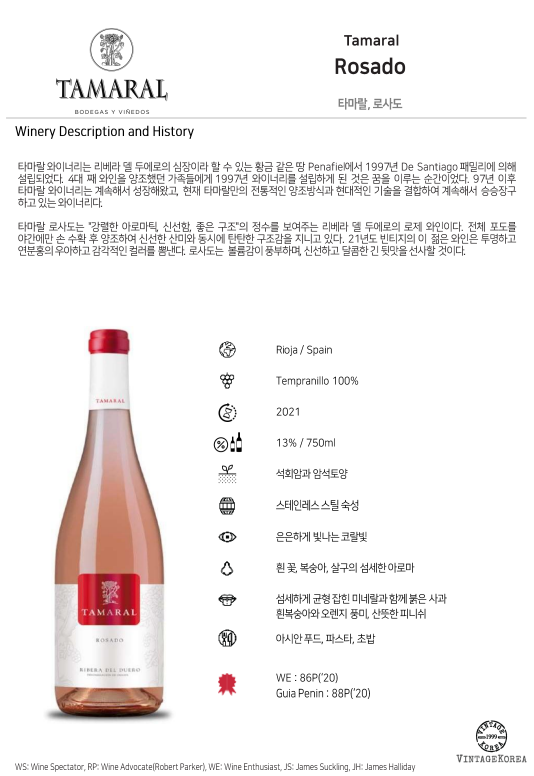 타마랄 로사도는 "강렬한 아로마틱, 신선함, 좋은 구조"의 정수를 보여주는 리베라 델 두에로의 로제 와인이다. 전체 포도를 야간에만 손 수확 후 양조하여 신선한 산미와 동시에 탄탄한 구조감을 지니고 있다. 21년도 빈티지의 이 젊은 와인은 투명하고 연분홍의 우아하고 감각적인 컬러를 뽐낸다. 로사도는 볼륨감이 풍부하며, 신선하고 달콤한 긴 뒷맛을 선사할 것이다.