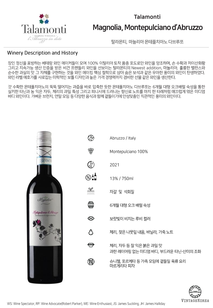 장인 정신을 표방하는 베테랑 와인 메이커들이 모여 100% 이탈리아 토착 품종 포도로만 와인을 양조하며, 손 수확과 저이산화황 그리고 지속가능 생산 인증을 받은 비건 프렌들리 와인을 선보이는 탈라몬티의 Newest addition, 마뇰리아. 훌륭한 밸런스와 순수한 과실의 맛 그 자체를 구현하는 것을 와인 메이킹 핵심 철학으로 삼아 숨은 보석과 같은 우아한 풍미의 와인이 탄생하였다. 와인 라벨 애호가를 사로잡는 미학적인 보틀 디자인과 높은 가격 경쟁력까지 겸비한 선물 같은 와인을 생산한다.