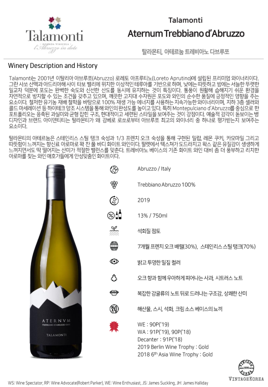 탈라몬티의 아테르눔은 스테인리스 스틸 탱크 숙성과 1/3 프렌치 오크 숙성을 통해 구현된 밀랍, 레몬 쿠키, 카모마일 그리고 따뜻함이 느껴지는 향신료 아로마로 꽉 찬 풀 바디 화이트 와인이다. 팔렛에서 텍스쳐가 도드라지고 왁스 같은 유질감이 생생하게 느껴지면서도 딱 떨어지는 산미가 적절한 밸런스를 맞춘다. 트레비아노 베이스의 기존 화이트 와인 대비 좀 더 풍부하고 리치한 아로마를 찾는 와인 애호가들에게 안성맞춤인 화이트이다.