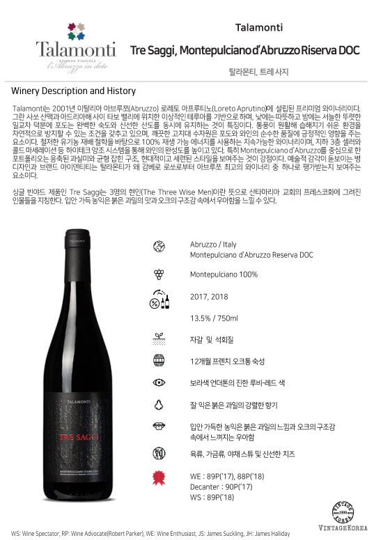 싱글 빈야드 제품인 Tre Saggi는 3명의 현인(The Three Wise Men)이란 뜻으로 산타마리아 교회의 프레스코화에 그려진 인물들을 지칭한다. 입안 가득 농익은 붉은 과일의 맛과 오크의 구조감 속에서 우아함을 느낄 수 있다.