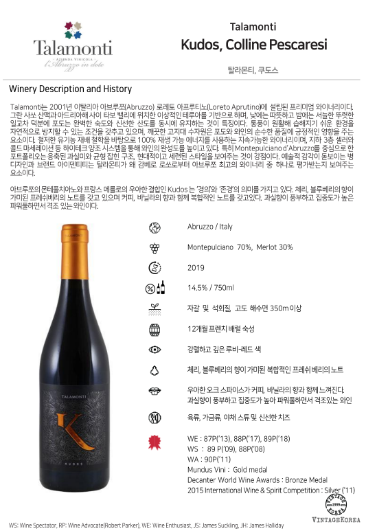 아브루쪼의 몬테풀치아노와 프랑스 메를로의 우아한 결합인 Kudos 는 ‘경의’와 ‘존경’의 의미를 가지고 있다. 체리, 블루베리의 향이 가미된 프레쉬베리의 노트를 갖고 있으며 커피, 바닐라의 향과 함께 복합적인 노트를 갖고있다. 과실향이 풍부하고 집중도가 높은 파워풀하면서 격조 있는 와인이다.