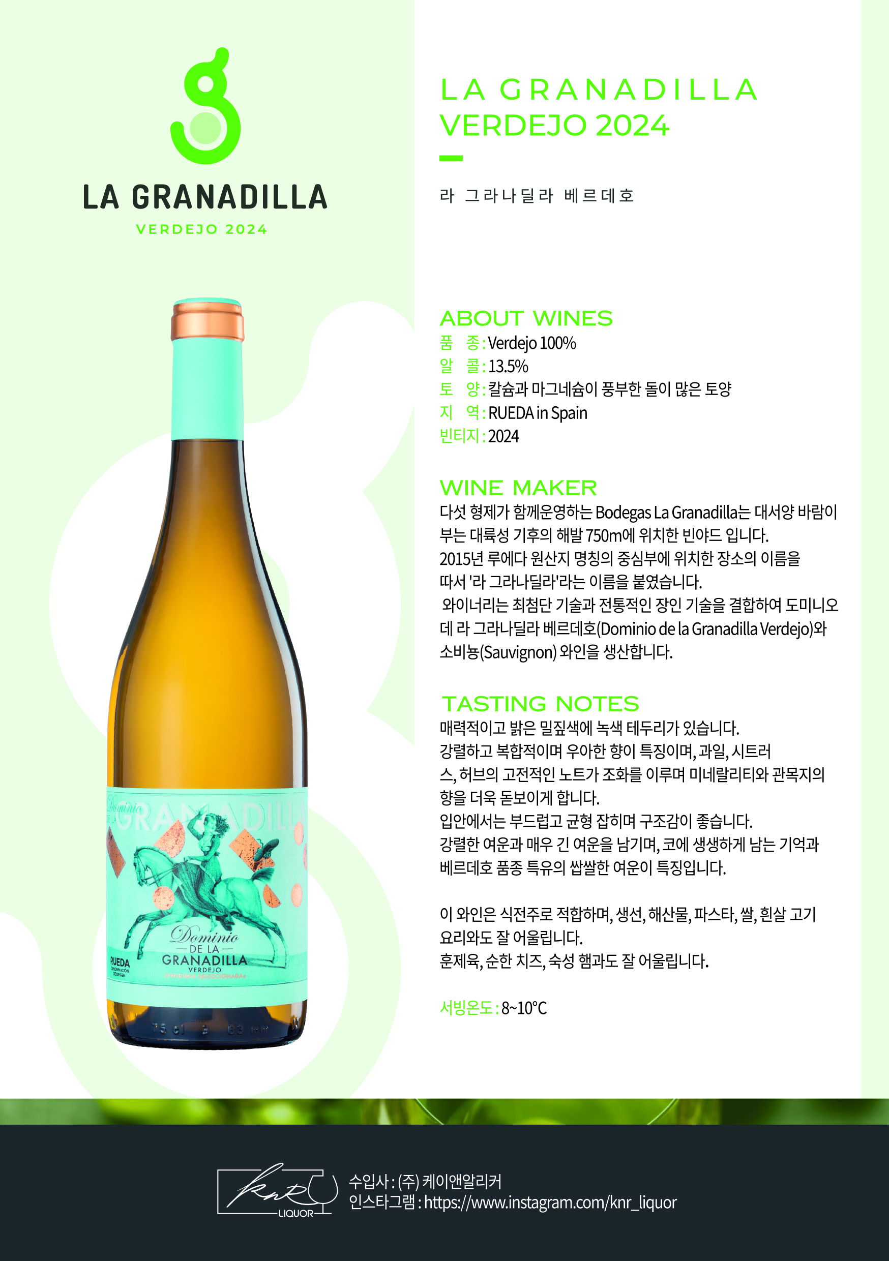 강렬한 여운과 매우 긴 여운을 남기며, 코에 생생하게 남는 기억과 베르데호 품종 특유의 쌉쌀한 여운이 특징입니다.