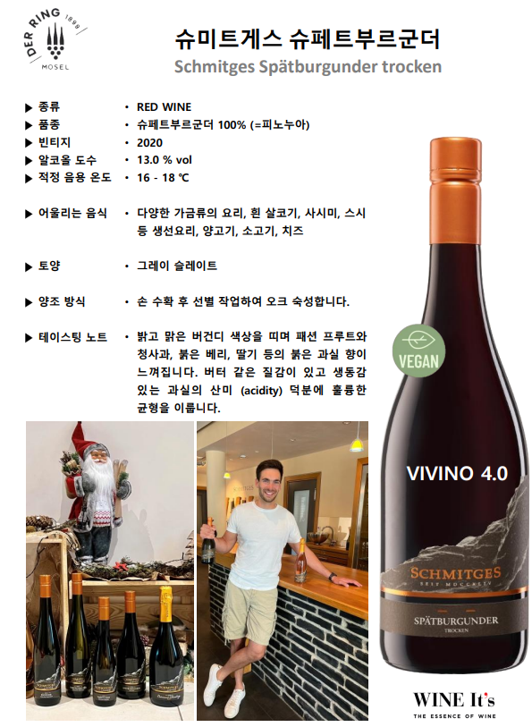 밝고 맑은 버건디 색상을 띠며 패션 프루트와 청사과, 붉은 베리, 딸기 등의 붉은 과실 향이 느껴집니다. 버터 같은 질감이 있고 생동감 있는 과실의 산미 (acidity) 덕분에 훌륭한 균형을 이룹니다.