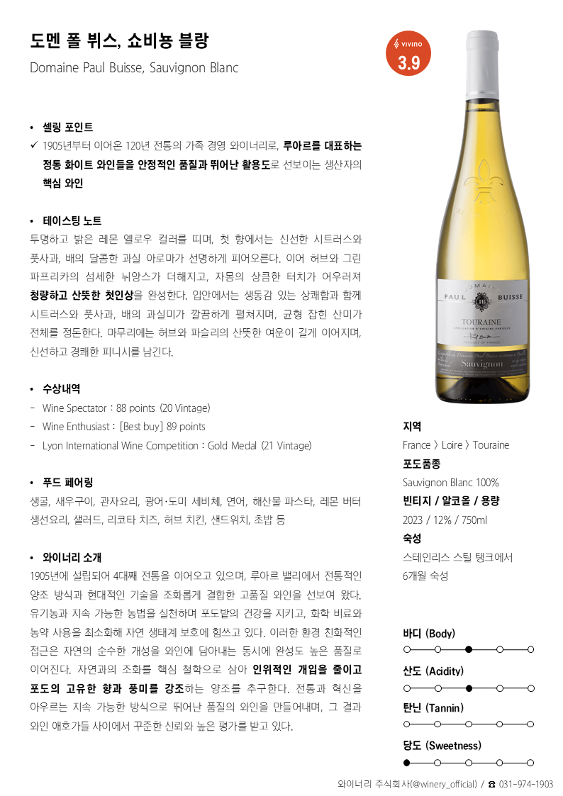 투명하고 밝은 레몬 옐로우 컬러를 띠며, 첫 향에서는 신선한 시트러스와 풋사과, 배의 달콤한 과실 아로마가 선명하게 피어오른다. 이어 허브와 그린 파프리카의 섬세한 뉘앙스가 더해지고, 자몽의 상큼한 터치가 어우러져 청량하고 산뜻한 첫인상을 완성한다. 입안에서는 생동감 있는 상쾌함과 함께 시트러스와 풋사과, 배의 과실미가 깔끔하게 펼쳐지며, 균형 잡힌 산미가 전체를 정돈한다. 마무리에는 허브와 파슬리의 산뜻한 여운이 길게 이어지며, 신선하고 경쾌한 피니시를 남긴다.
