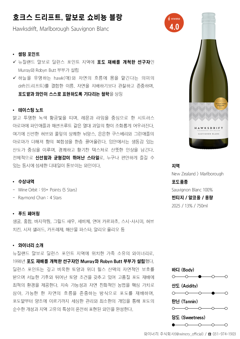 밝고 투명한 녹색 황금빛을 띠며, 레몬과 라임을 중심으로 한 시트러스 아로마에 파인애플과 패션프루트 같은 열대 과일의 향이 조화롭게 어우러진다. 여기에 신선한 허브와 풀잎의 상쾌한 뉘앙스, 은은한 구스베리와 그린애플의 아로마가 더해져 향의 복합성을 한층 끌어올린다. 입안에서는 생동감 있는 산도가 중심을 이루며, 경쾌하고 활기찬 텍스처로 산뜻한 인상을 남긴다. 전체적으로 신선함과 균형감이 뛰어난 스타일로, 누구나 편안하게 즐길 수 있는 동시에 섬세한 디테일이 돋보이는 와인이다.