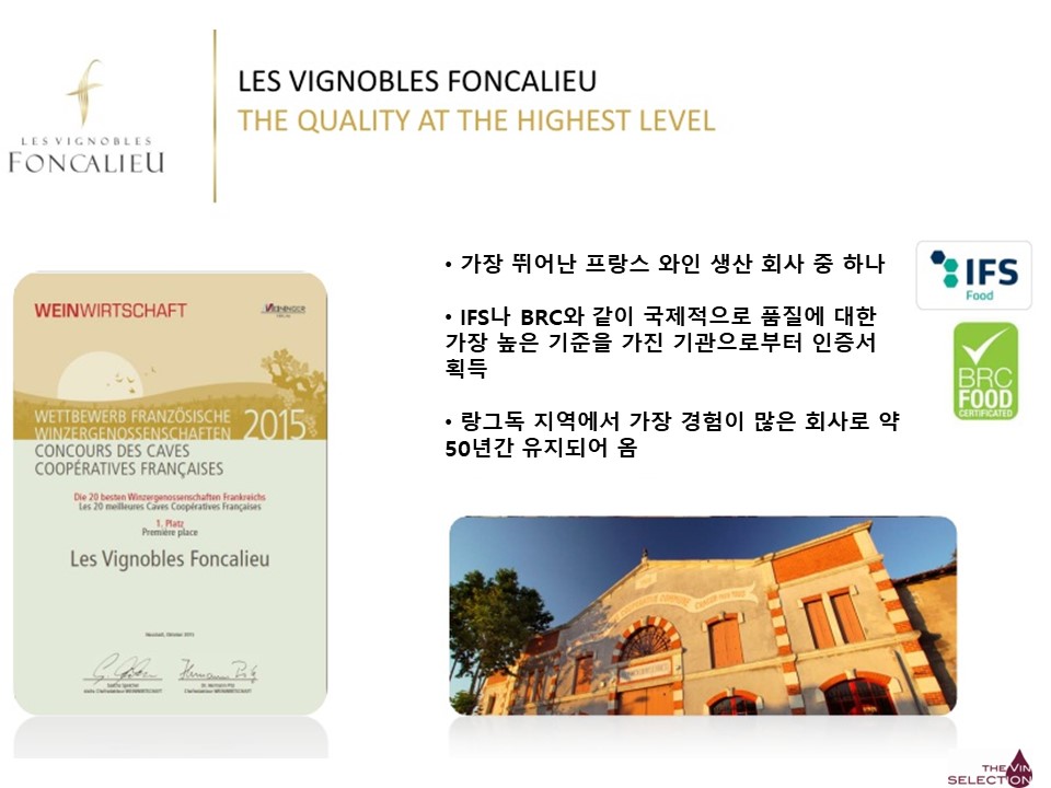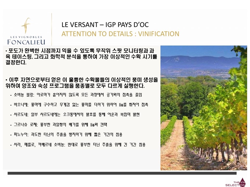 여러 종류의 검붉은 과실들의 풍미가 부드럽게 전달되며, 충분한 탄닌의 질감을 바탕으로 일관된 골격을 갖추고 있다. 기분 좋은 스파이시함과 모나지 않은 타입으로 많은 아시아 요리들과의 매칭이 용이하다.
