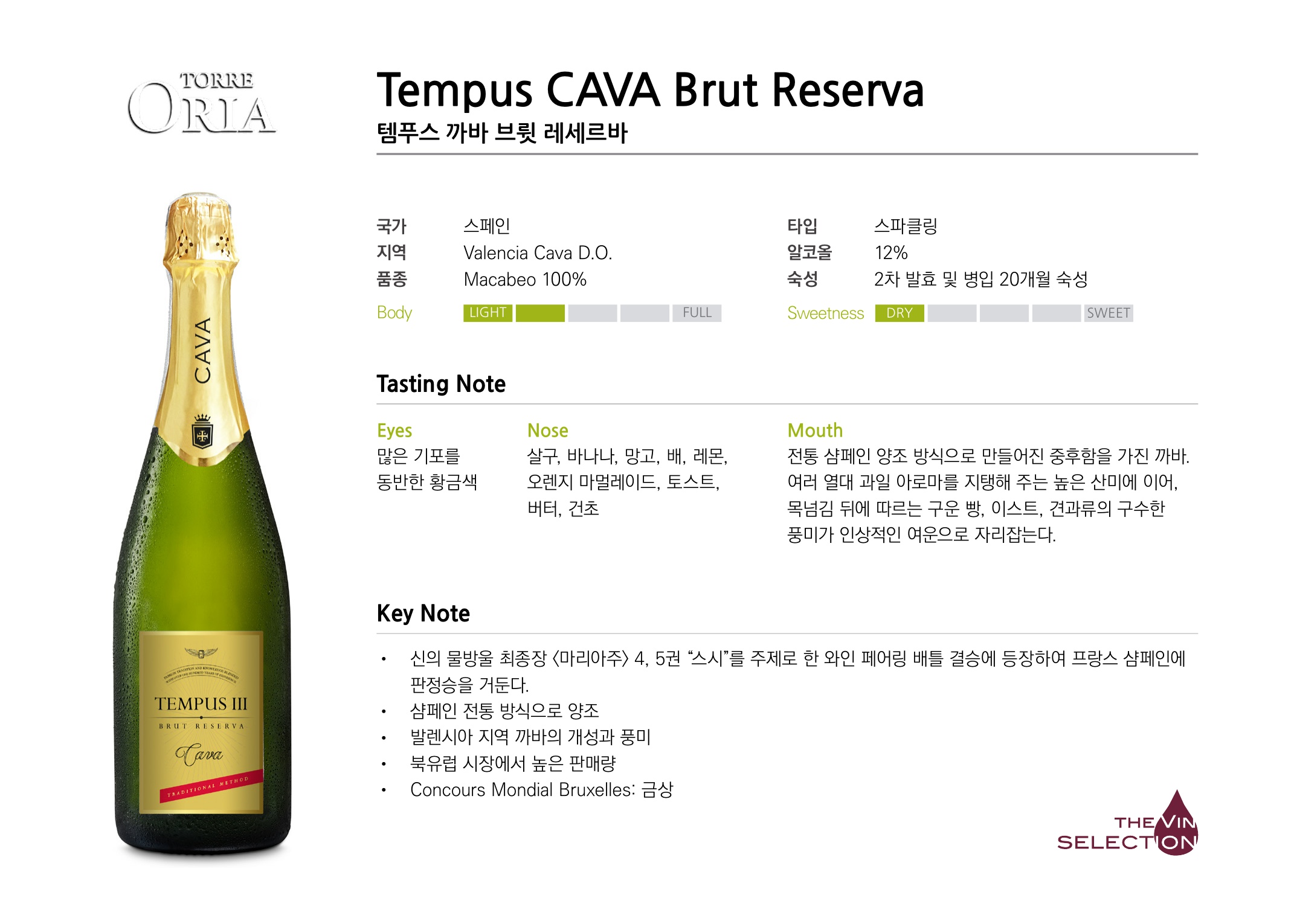 전통 샴페인 양조 방식으로 만들어진 중후함을 가진 까바. 여러 열대 과일 아로마를 지탱해 주는 은은한 산미에 이어, 목넘김 뒤에 따르는 중성적인 느낌의 견과류 풍미가 여운을 마무리한다.