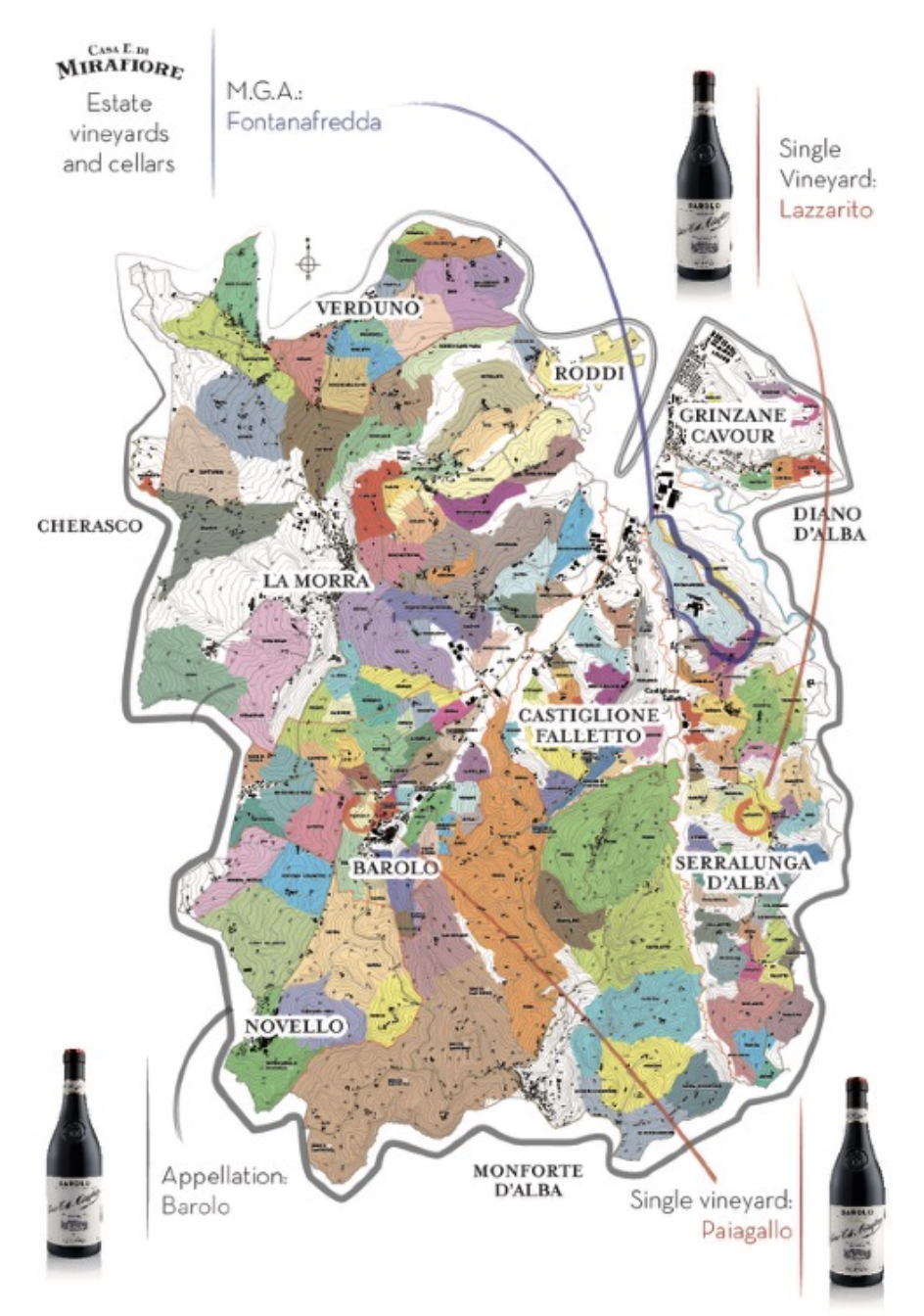미라피오레는 여러 Cru Barolos (Lazzarito, Paiagallo 등)를 생산하고 있습니다. 대부분 와인은 세라룽가 달바 지역의 포도로 만들어집니다. 통상적으로 단단하고 묵직한 세라룽가 달바의 바롤로와 달리 미라피오레의 바롤로는 상당히 섬세하고 우아하며 고급스러운 느낌을 느끼게 해줍니다. 바롤로 외 Langhe Rosso, Dolcetto 역시 바롤로에서 보여주는 섬세하고 우아한 면을 느낄 수 있습니다.