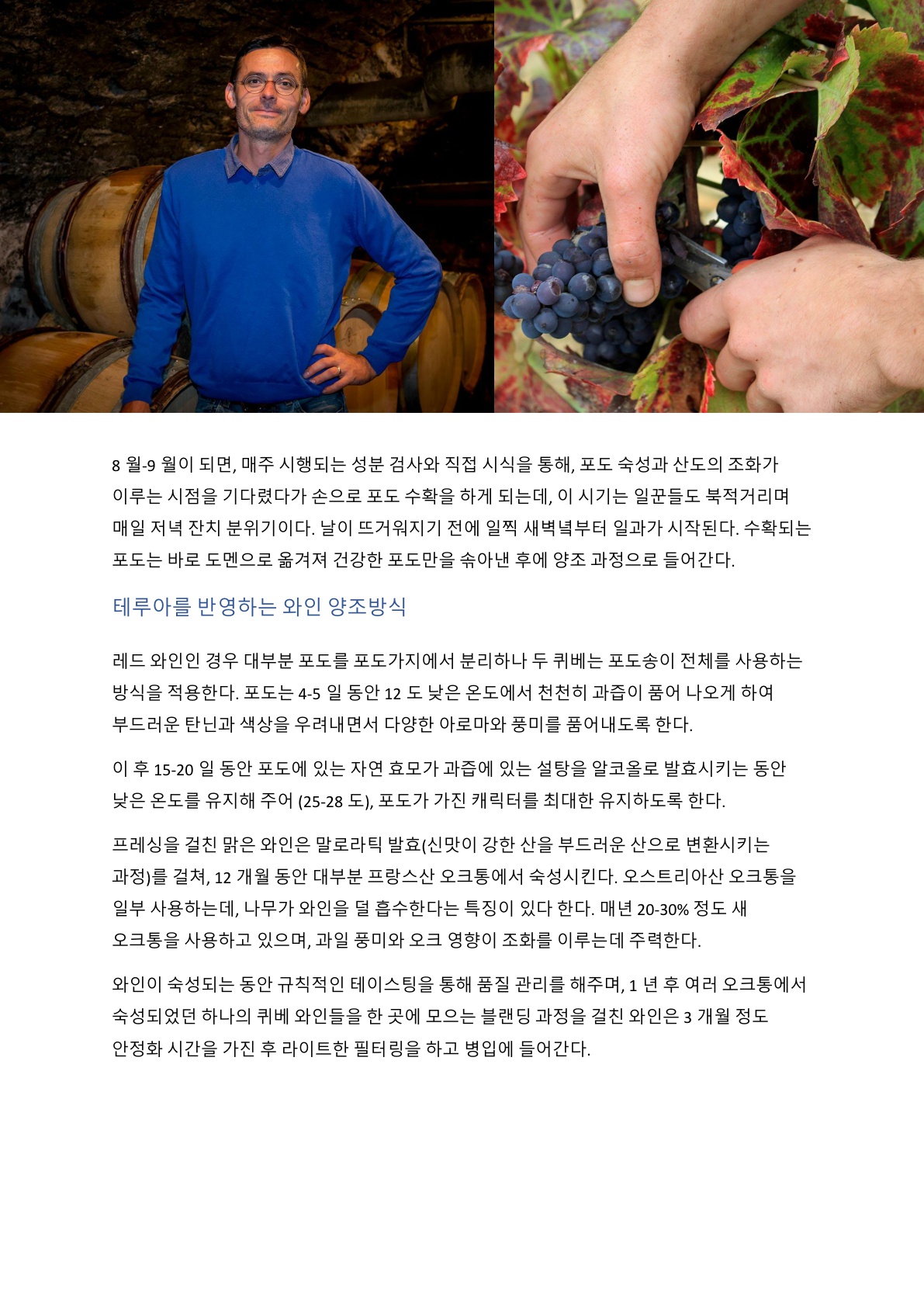 전반적으로 붉은 과실 계열의 아로마가 응축되어 발현되고, 골격의 중심을 이루는 타닌과 산미가 생동감 있게 느껴진다. 드라이한 스파이시함이 깔끔한 뒷맛을 남기는 동시에 벨벳 같은 촉감이 긴 여운을 동반한다. 갈비찜, 스테이크, 양고기 등의 붉은 육류와 잘 어울린다.
