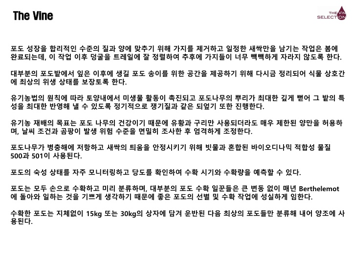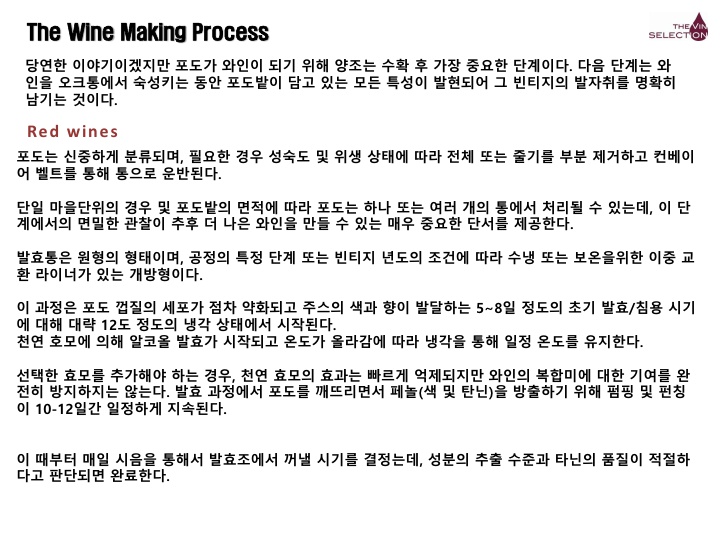 화이트 와인임에도 상당히 힘 있고 인상적인 과실 아로마를 내뿜으며, 입 안과 비강 전체에 화려하고 풍만한 풍미를 선사한다. 오크 캐스크에서의 숙성미가 완벽에 가까울 정도로 잘 다듬어져 부드러운 질감과 바닐라의 여운이 입 안에 오래 머문다. 생선회, 문어숙회, 크림 파스카, 칠면조 구이 등과 좋은 페어링을 이룬다.