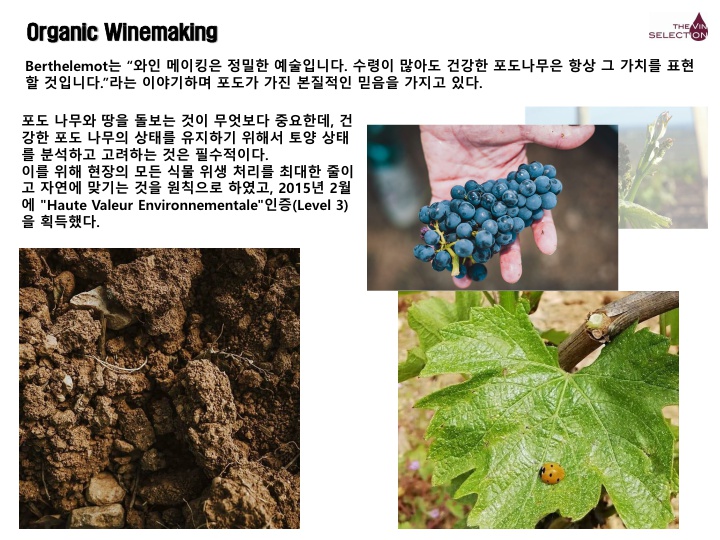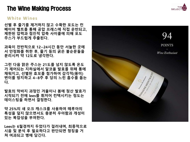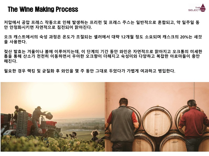 화사하고 집중력있는 붉은 과실의 아로마가 비강을 통해 감각적으로 전달된다. 우아하고 벨벳티한 탄닌이 혀를 감싸고 부드러운 목넘김 이후에 좋은 산미가 여운을 이끈다.