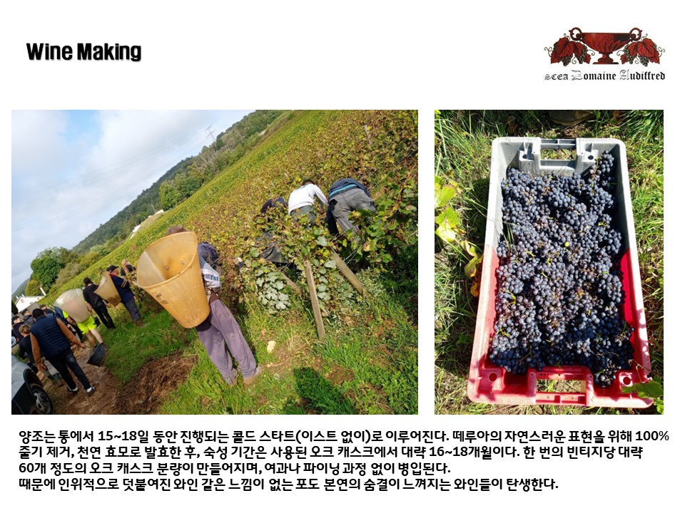 붉은 과일 계열의 아로마들과 깨끗한 산미가 부드럽게 조화를 이룬다. 볼륨감 있고 우아한 풍미와 질감이 잎 안에 오래 머물며, 숙성시 다양한 부케와 오밀조밀한 복합미가 잘 드러난다. 그릴 요리, 치즈, 파스타는 물론 딸기나 체리와 같은 과일 디저트와도 잘 어울린다.