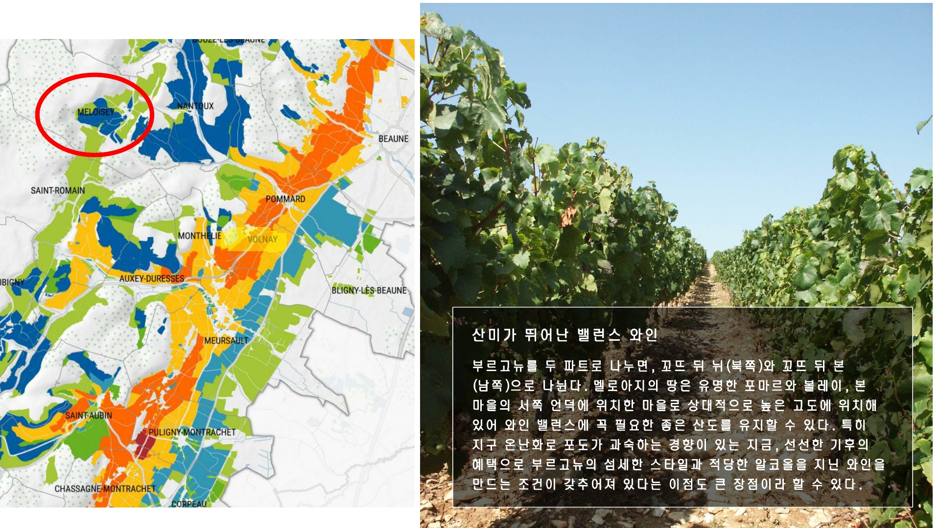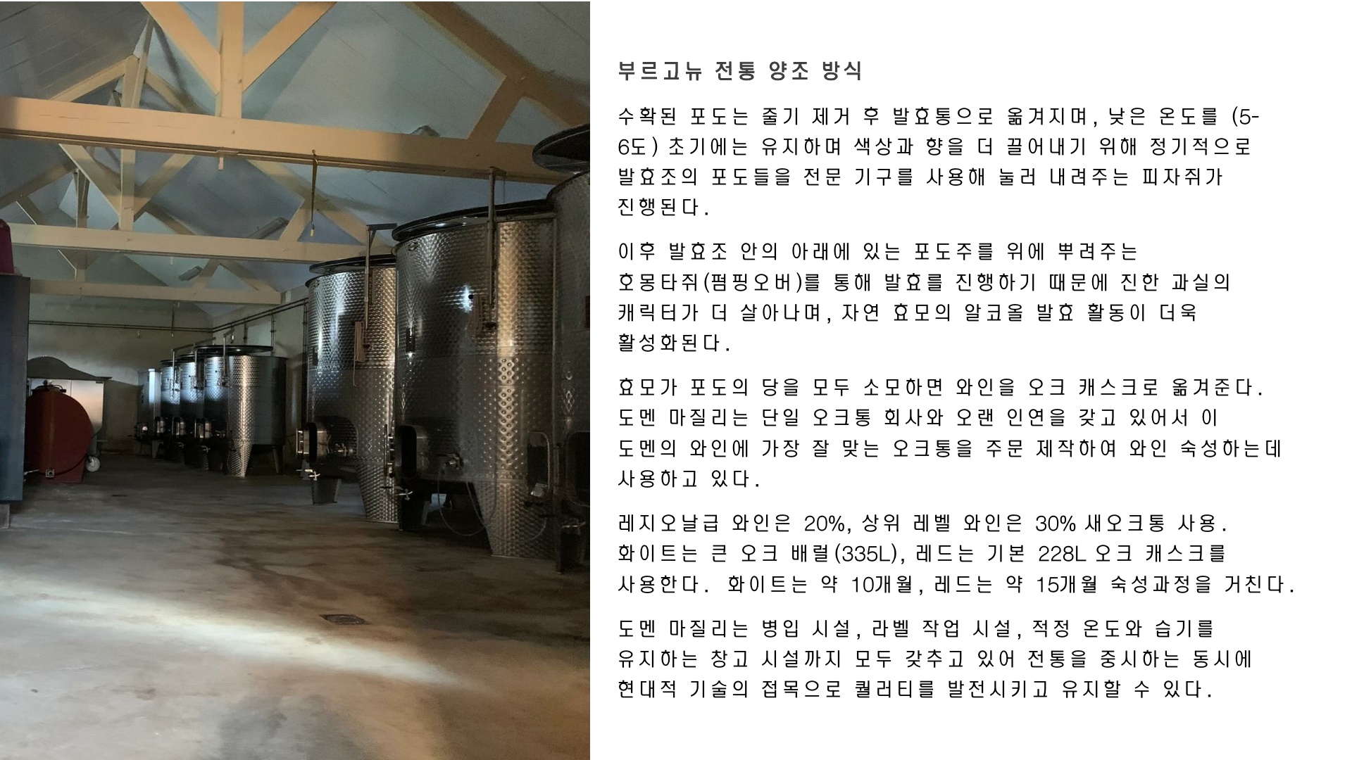 다채로운 붉은 과실들의 풍미가 둥글둥글하게 입 안에 부드럽게 퍼진다. 뒤어어 풍부하지만 날카롭지 않는 산미가 기분 좋은 여운을 끝까지 잡아 준다. 크림 리조또 및 파스타는 물론 육회, 항정살 등의 담백한 육류 요리와 잘 어울린다.