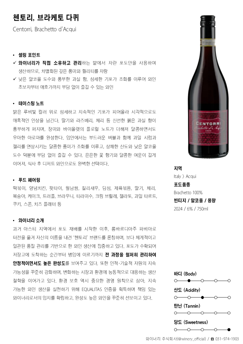 밝은 루비빛 컬러 위로 섬세하고 지속적인 기포가 피어올라 시각적으로도 매혹적인 인상을 남긴다. 딸기와 라즈베리, 체리 등 신선한 붉은 과실 향이 풍부하게 퍼지며, 장미와 바이올렛의 플로럴 노트가 더해져 달콤하면서도 우아한 아로마를 완성한다. 입안에서는 부드러운 버블과 함께 과일 시럽과 젤리를 연상시키는 달콤한 풍미가 조화를 이루고, 상쾌한 산도와 낮은 알코올 도수 덕분에 부담 없이 즐길 수 있다. 은은한 꽃 향기와 달콤한 여운이 길게 이어져, 식사 후 디저트 와인으로도 완벽한 선택이다.