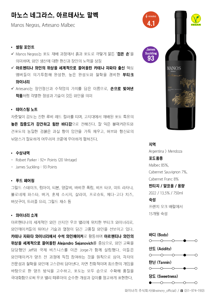 아르헨티나의 세계적인 와인 산지인 우코 밸리에 위치한 부티크 와이너리로, 와인메이커들의 뛰어난 기술과 열정이 담긴 고품질 와인을 선보이고 있다. 카테나 자파타 와이너리에서 수석 와인메이커로 활동하며 아르헨티나 와인의 위상을 세계적으로 끌어올린 Alejandro Sejanovich를 중심으로, 와인 교육을 담당했던 Jeff와 국제 비즈니스를 이끈 Jorge가 함께 설립했다. 이들은 와인메이커가 양조 전 과정에 직접 참여하는 것을 원칙으로 삼아, 각자의 전문성과 철학을 와인에 고스란히 담아낸다. 자연 친화적이며 최소한의 개입을 바탕으로 한 양조 방식을 고수하고, 포도는 모두 손으로 수확해 품질을 극대화함으로써 우코 밸리 떼루아의 순수한 개성과 깊이를 정교하게 표현한다.