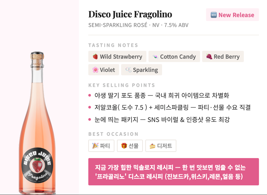 향은 “신선한 딸기, 붉은 열매, 젤리나 사탕을 연상시키는 부드럽고 과일향”이 강하고 “과일향 탄산 음료 + 와인” 느낌이 있을 수 있습니다.