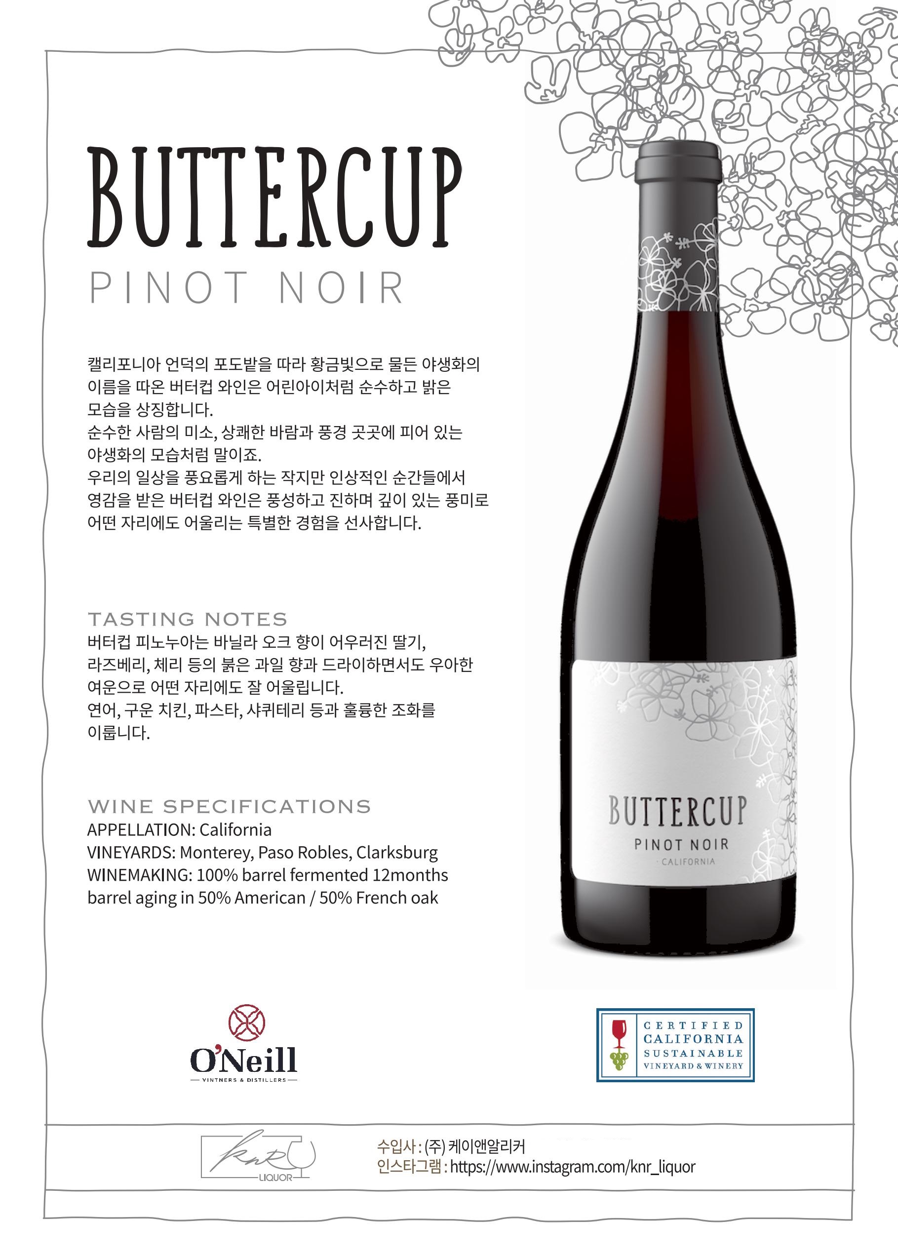 버터컵 피노누아는 잘 익은 체리, 라즈베리, 석류 등의 붉은 과실 향과 바닐라, 버터, 오크, 삼나무 향이