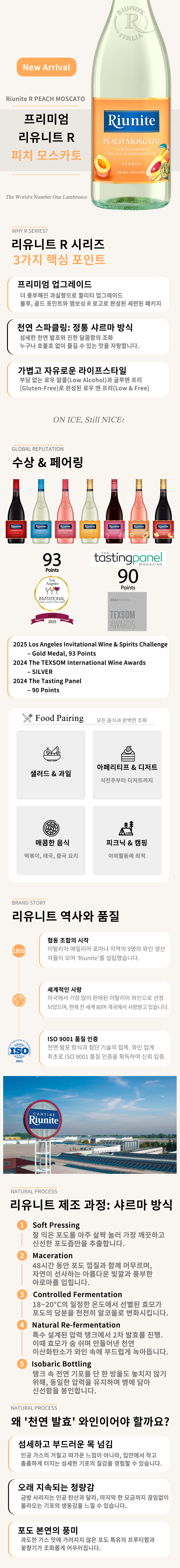 영롱한 밝은 핑크색이 눈길을 사로잡는 리유니트 R 피치 모스카토는 짙은 복숭아, 꿀과 세이지가 함께 어우러진 부케로 오감을 사로 잡습니다. 짙은 복숭아와 꿀향이 어우러지며, 깔끔하고 짙은 복숭아 맛과 달콤하고 부드러운 향을 지닌 와인입니다.