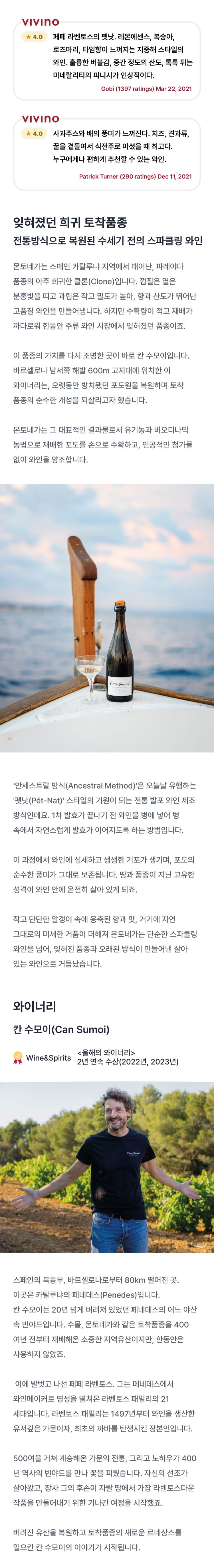 페페 라벤토스의 펫낫. 레몬에센스, 복숭아, 로즈마리, 타임향이 느껴지는 지중해 스타일의 와인. 훌륭한 버블감, 중간 정도의 산도, 톡톡 튀는 미네랄리티의 피니시가 인상적 입니다.