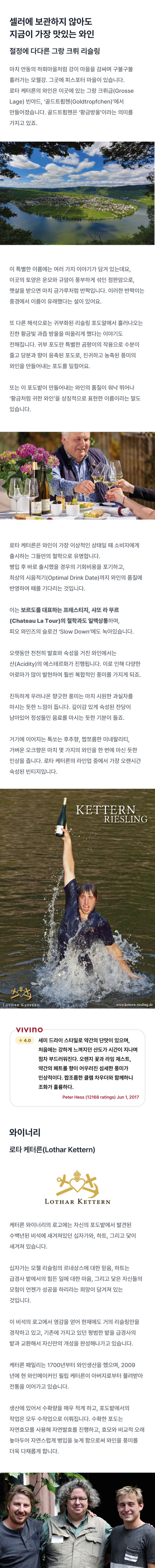 세미 드라이 스타일로 약간의 단맛이 있으며, 처음에는 강하게 느껴지던 산도가 시간이 지나며 점차 부드러워집니다. 오렌지 꽃과 라임 제스트, 약간의 페트롤 향이 어우러진 섬세한 풍미가 인상적 입니다.