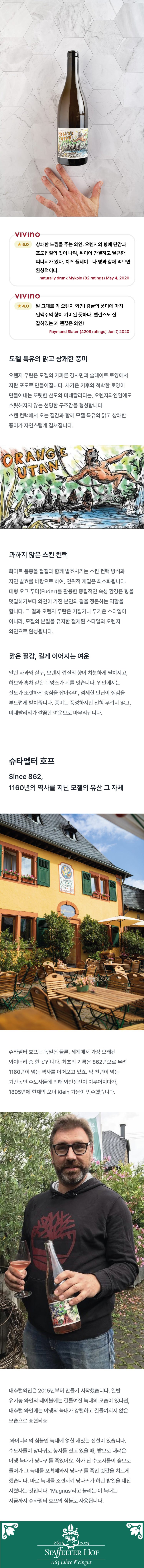 상쾌한 느낌을 주는 와인 입니다. 오렌지의 향에 단감과 포도껍질의 맛이 나며,