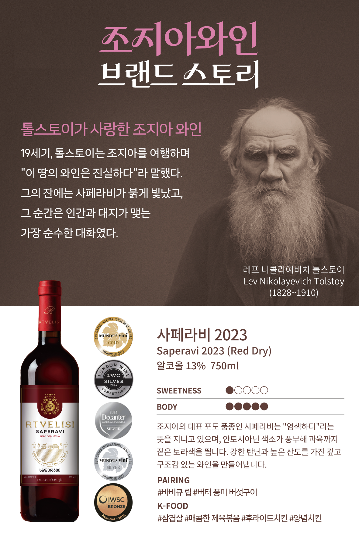 조지아 카헤티 지역의 명문 와이너리 RTVELISI는 이 사페라비 품종을 현대적인 기술과 전통의 양조 철학으로 재해석했습니다. 포도를 손수 선별한 뒤, 낮은 온도에서 천천히 발효시켜 향을 극대화하고, 오크 배럴 숙성을 통해 부드러운 탄닌과 고급스러운 질감을 완성합니다.
