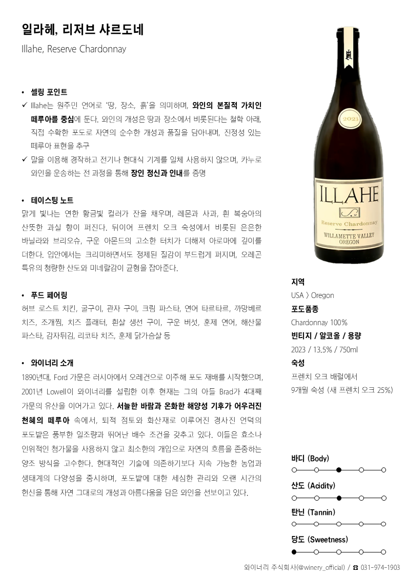 맑게 빛나는 연한 황금빛 컬러가 잔을 채우며, 레몬과 사과, 흰 복숭아의 산뜻한 과실 향이 퍼진다. 뒤이어 프렌치 오크 숙성에서 비롯된 은은한 바닐라와 브리오슈, 구운 아몬드의 고소한 터치가 더해져 아로마에 깊이를 더한다. 입안에서는 크리미하면서도 정제된 질감이 부드럽게 퍼지며, 오레곤 특유의 청량한 산도와 미네랄감이 균형을 잡아준다.