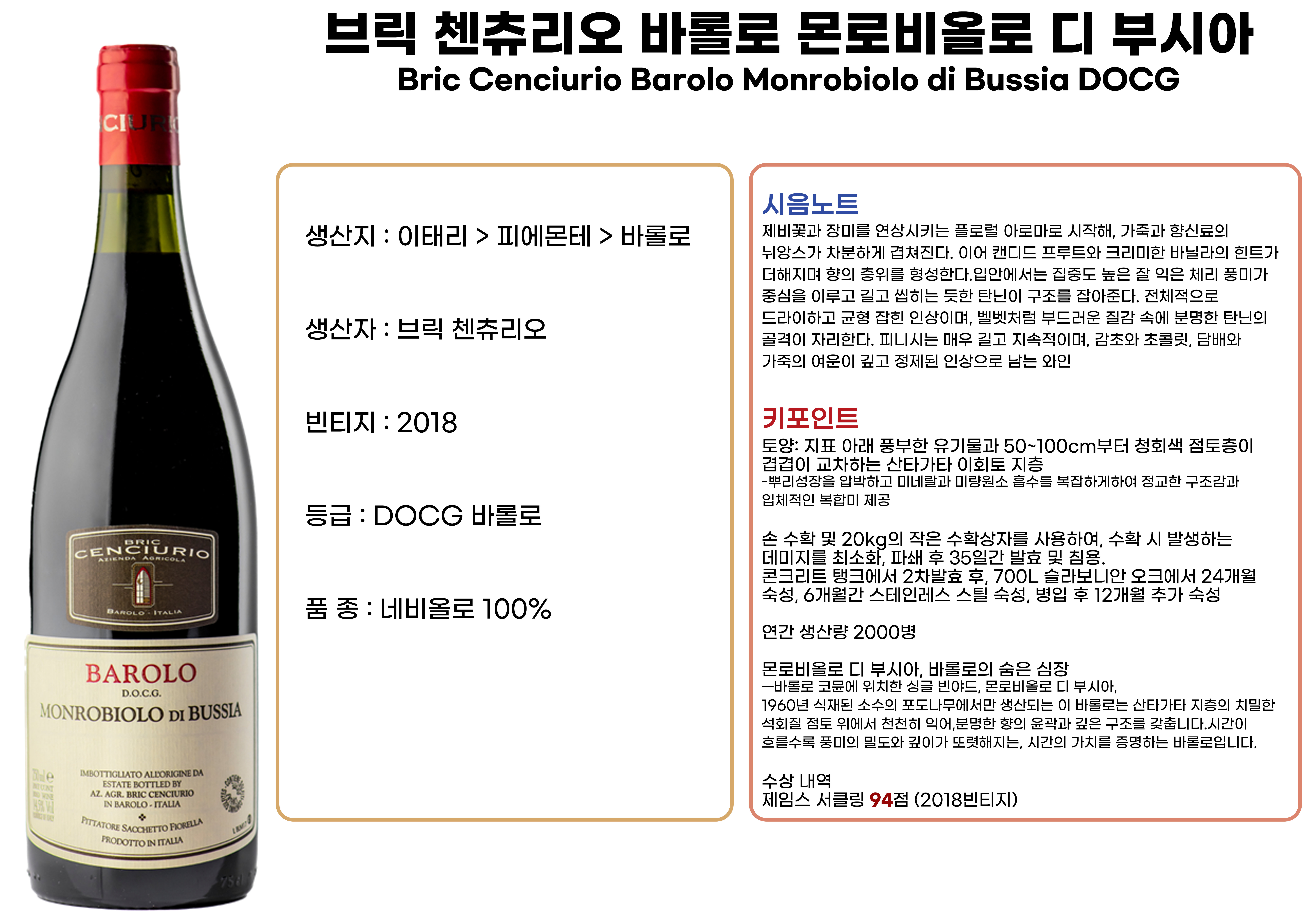 브릭 첸츄리오 바롤로 몬로비올로 디 부시아 DOCG 2018